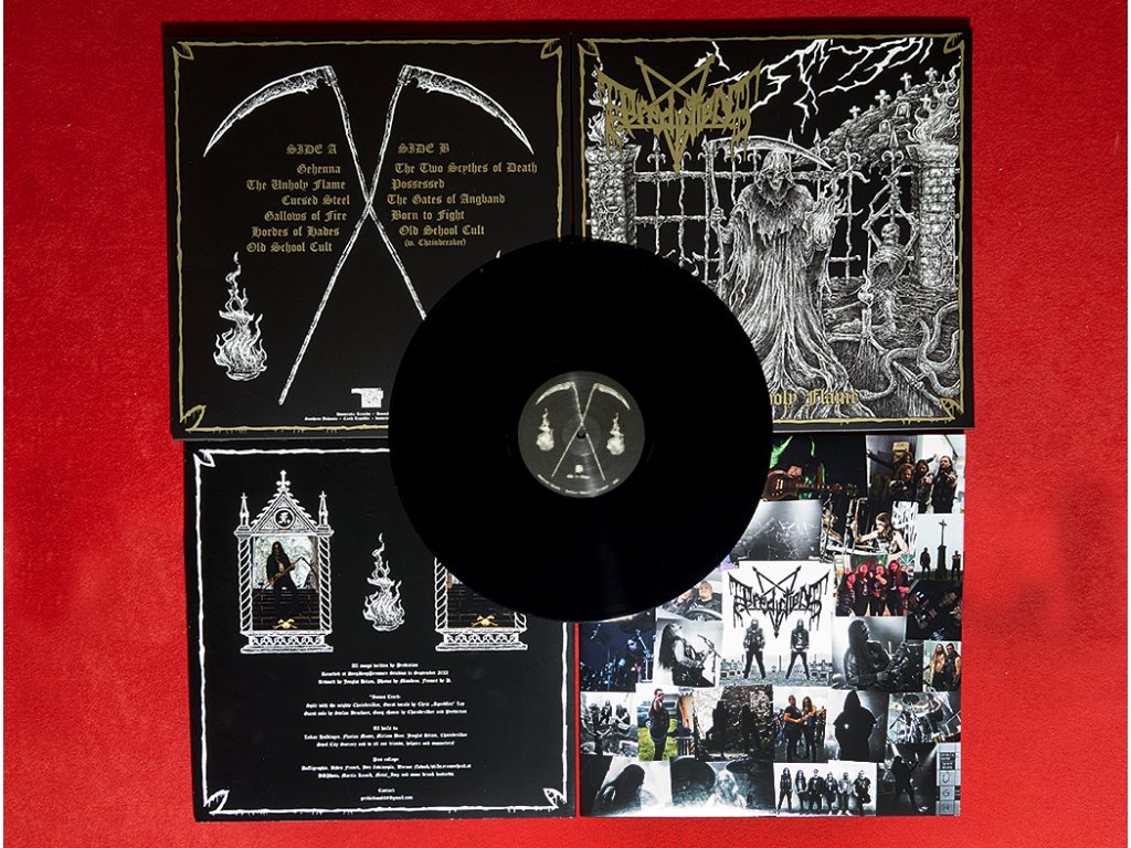 After two self-released albums, the Upper Austria duo of David Leppen (guitar and vocals) and Fabian Ditzlmüller (drums) are back with their third nuclear strike, and first for DOOMENTIA, The Unholy Flame. Tracked down at Deep Deep Pressure studios last September and released on LP (300 copies) and tape formats only, this new ten tracks (plus one hellish intro) effort not only does tap in the very roots of the genre from a fresh perspective as it was 1987 all over again but it also has the kind of urgency and drive that will make no prisoners! A never stopping roller coaster of pure 80’s METAL. And if this wasn’t enough, added as three stars bonus to this riffs orgy is the song “Old School Cult”, a nerve wrecking tribute to the speed metal sound of yore featuring their fellow countrymen and close allies of CHAINBREÄKER on both lead vocals and guitar solo.